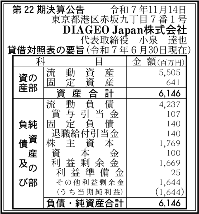 Diageo Japan Administration Services株式会社閉鎖済み 東京都港区 【2023年6月期】 |