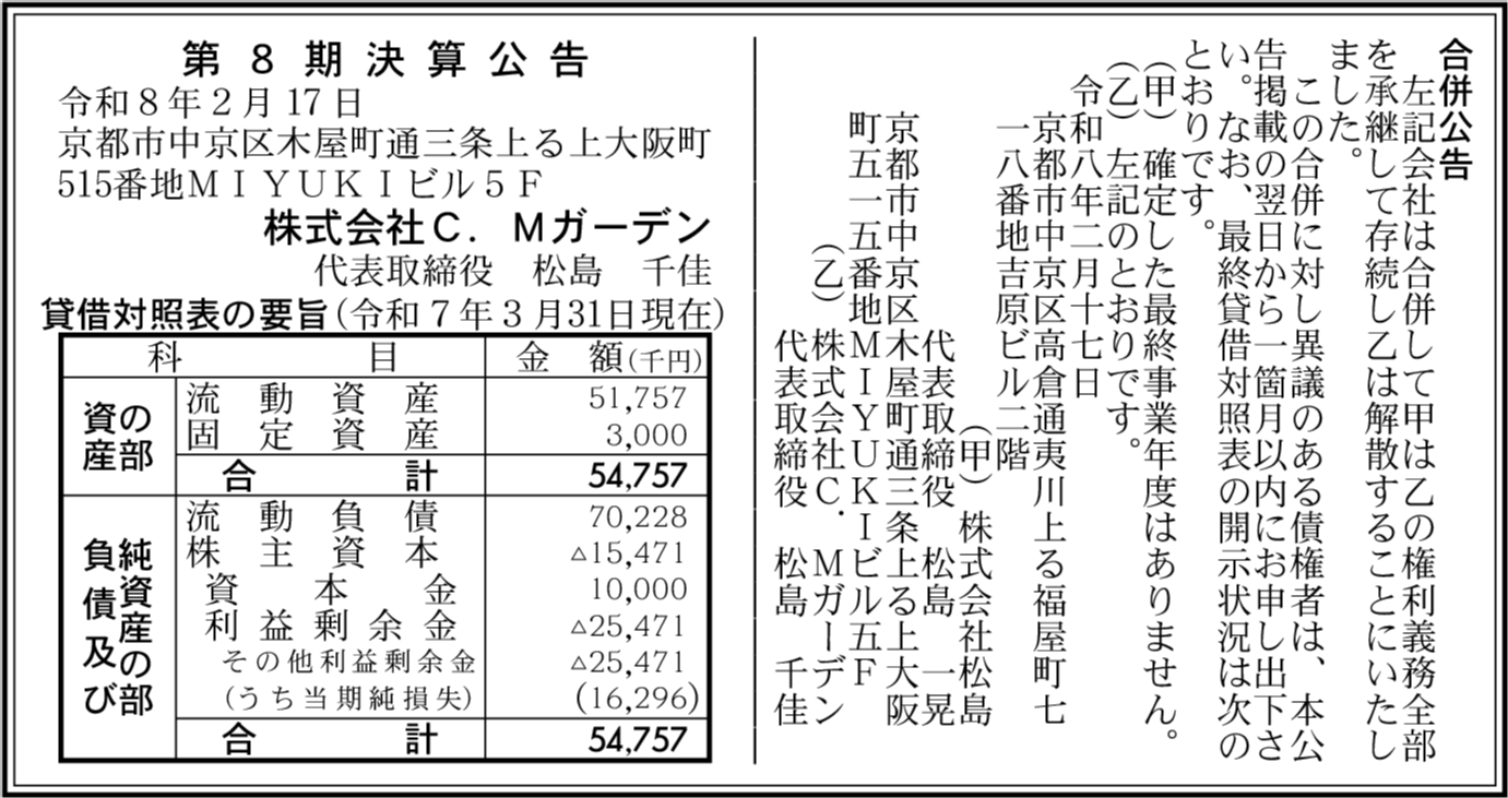 株式会社KASEN閉鎖済み 京都市右京区 【2020年12月期】 |