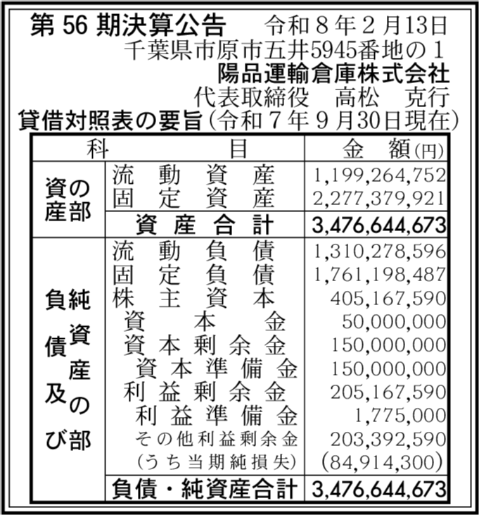 陽品運輸商事株式会社 千葉県袖ケ浦市 【2025年9月期】 |