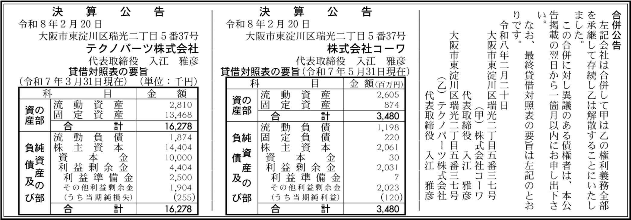 テクノパーツ株式会社 大阪市東淀川区 【2025年3月期】 |