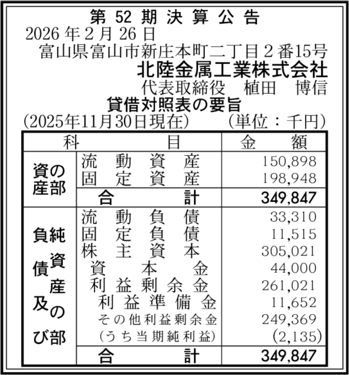 トヤマ圧延株式会社 富山県富山市 【2025年11月期】 |