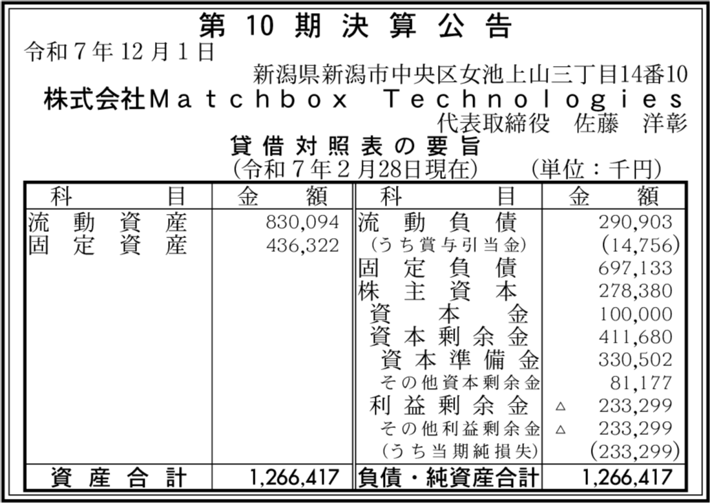 | 株式会社matchbox | 新潟市中央区 | △1,370万3,000円 |