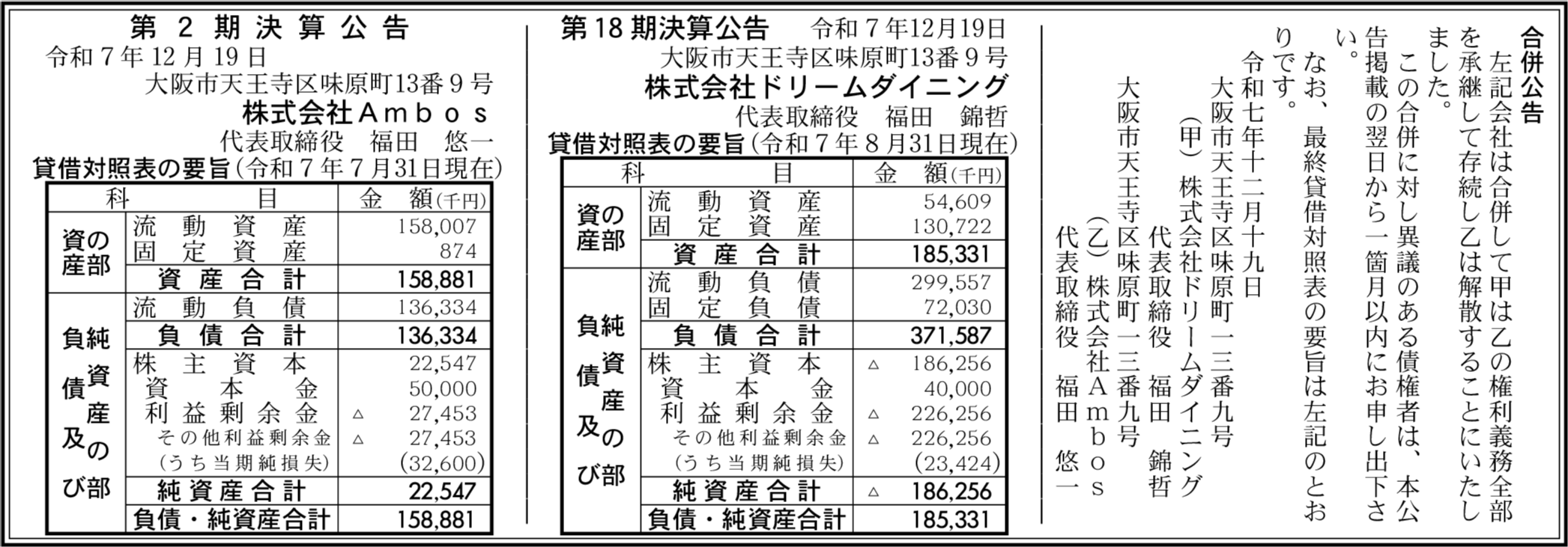 株式会社ドリームダイニング 大阪市天王寺区 【2025年8月期】 |