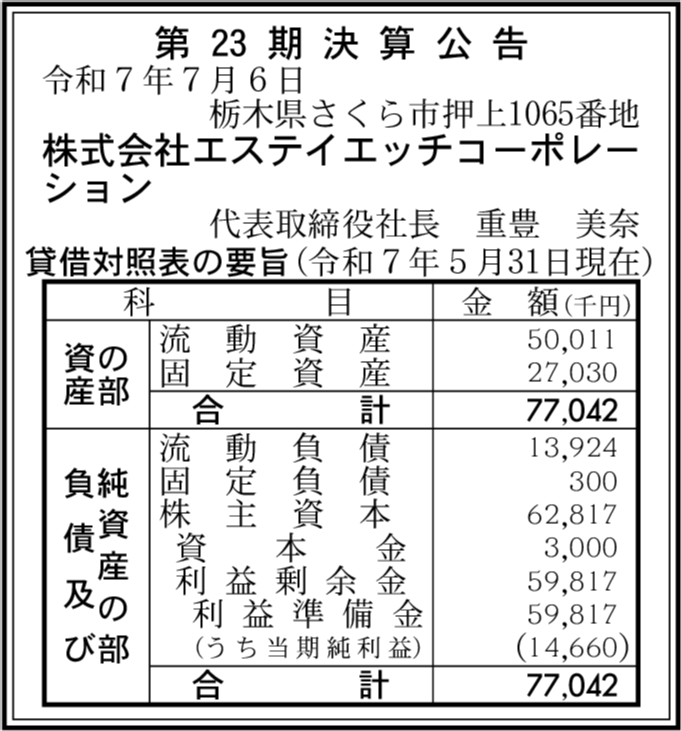 | 会社名 | 株式会社エステイエッチコーポレーション |