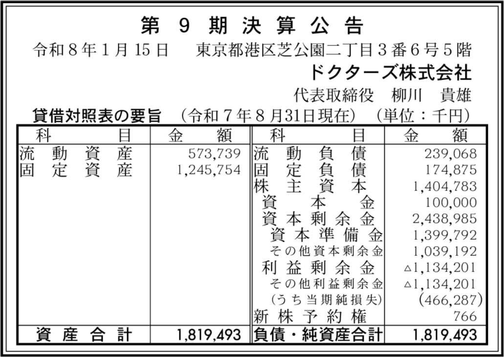 | 利益剰余金 | ▲11億3,420万1,000円 (赤字拡大) |