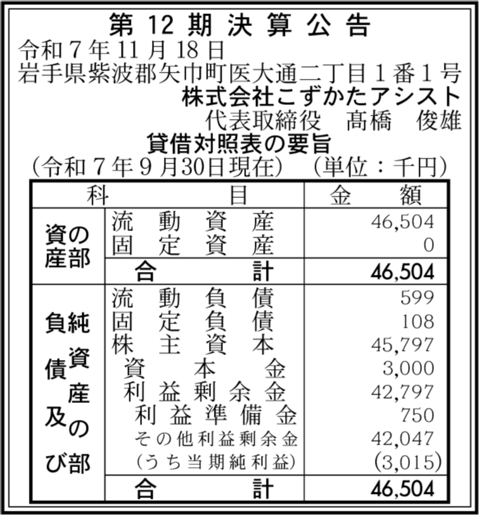 株式会社こずかたサービス 岩手県紫波郡矢巾町 【2025年9月期】 |