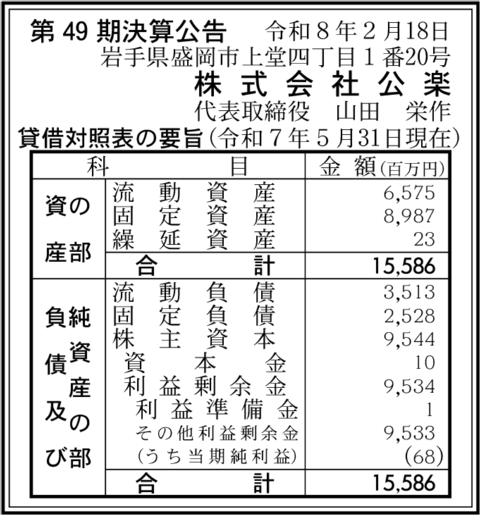 株式会社公楽開発 岩手県盛岡市 【2019年8月期】 |