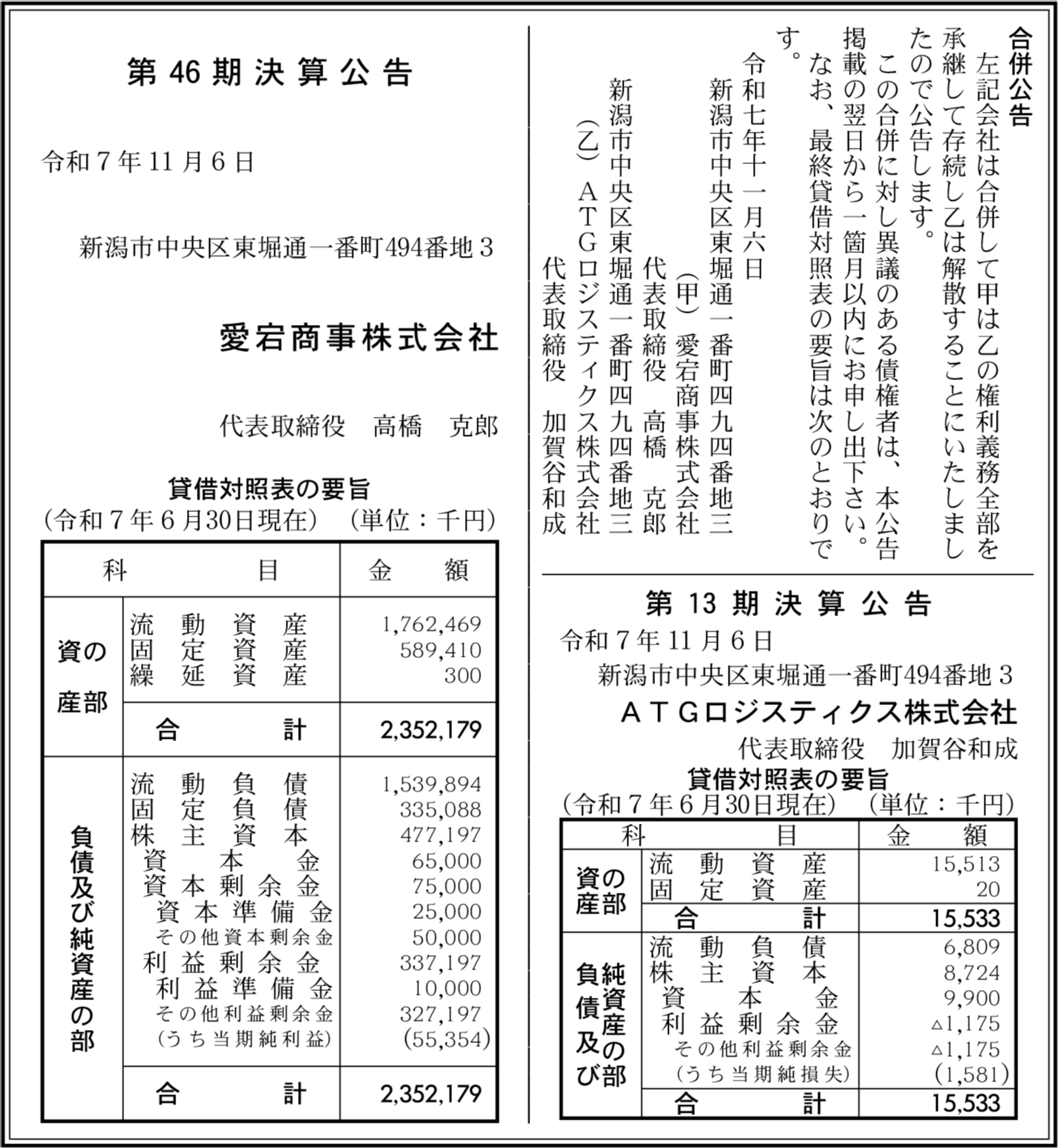 ATGロジスティクス株式会社 新潟市中央区 【2025年6月期】 |