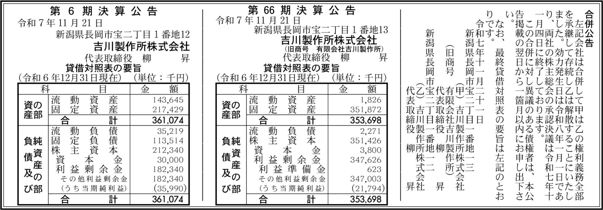 吉川製作所株式会社 新潟県長岡市 【2024年12月期】 |
