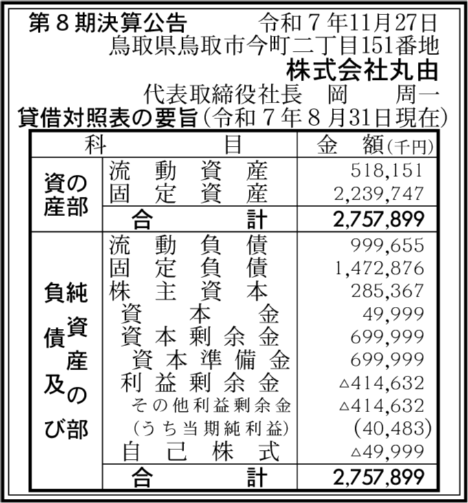 丸由友の会株式会社 鳥取県鳥取市 【2024年8月期】 |