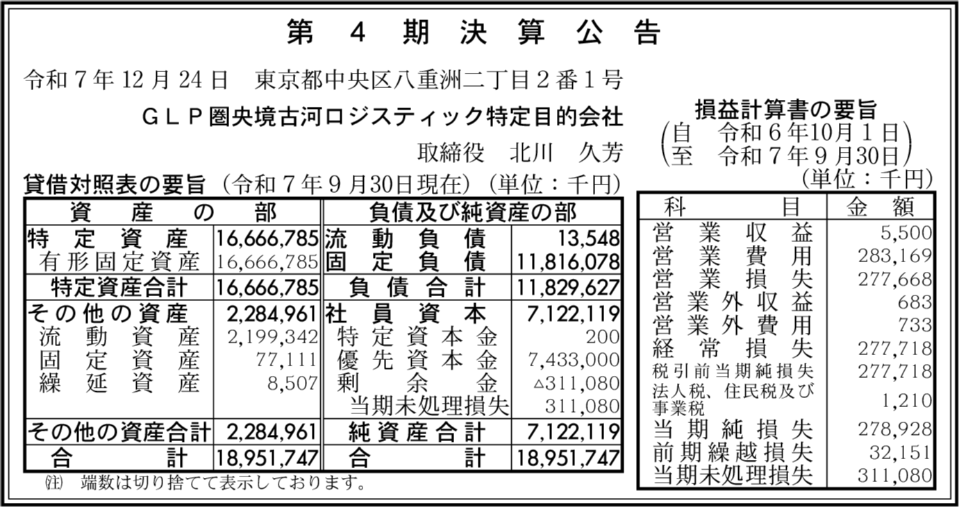 GLPプロパティ特定目的会社 東京都中央区 【2025年9月期】 |