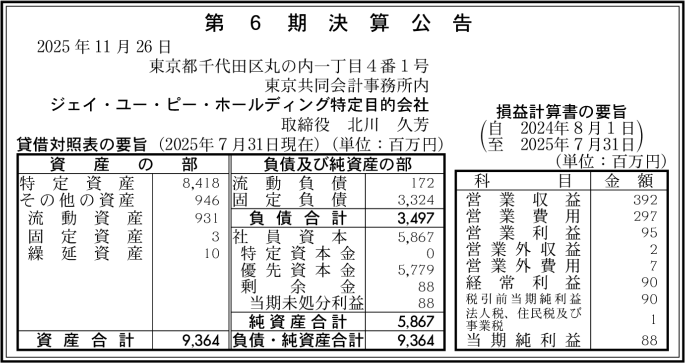 | 会社名 | ジェイ・ユー・ピー・ホールディング特定目的会社 |