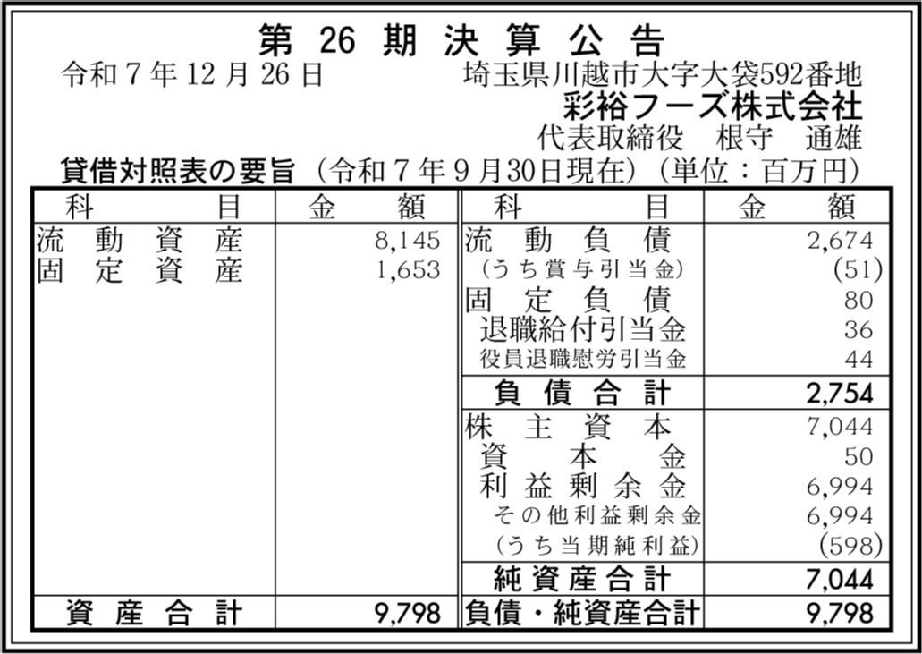 | 総資産 | 97億9,800万円 (+14.42%) |