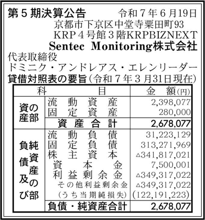 | 利益剰余金 | △3億4,931万7,022円 (赤字拡大) |