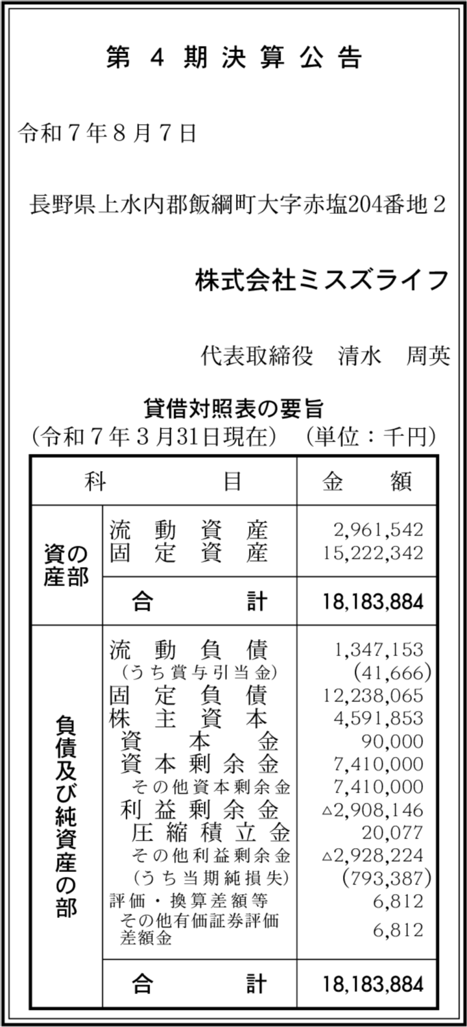 株式会社ミスズライフ閉鎖済み 長野県上水内郡飯綱町 【2021年3月期】 |
