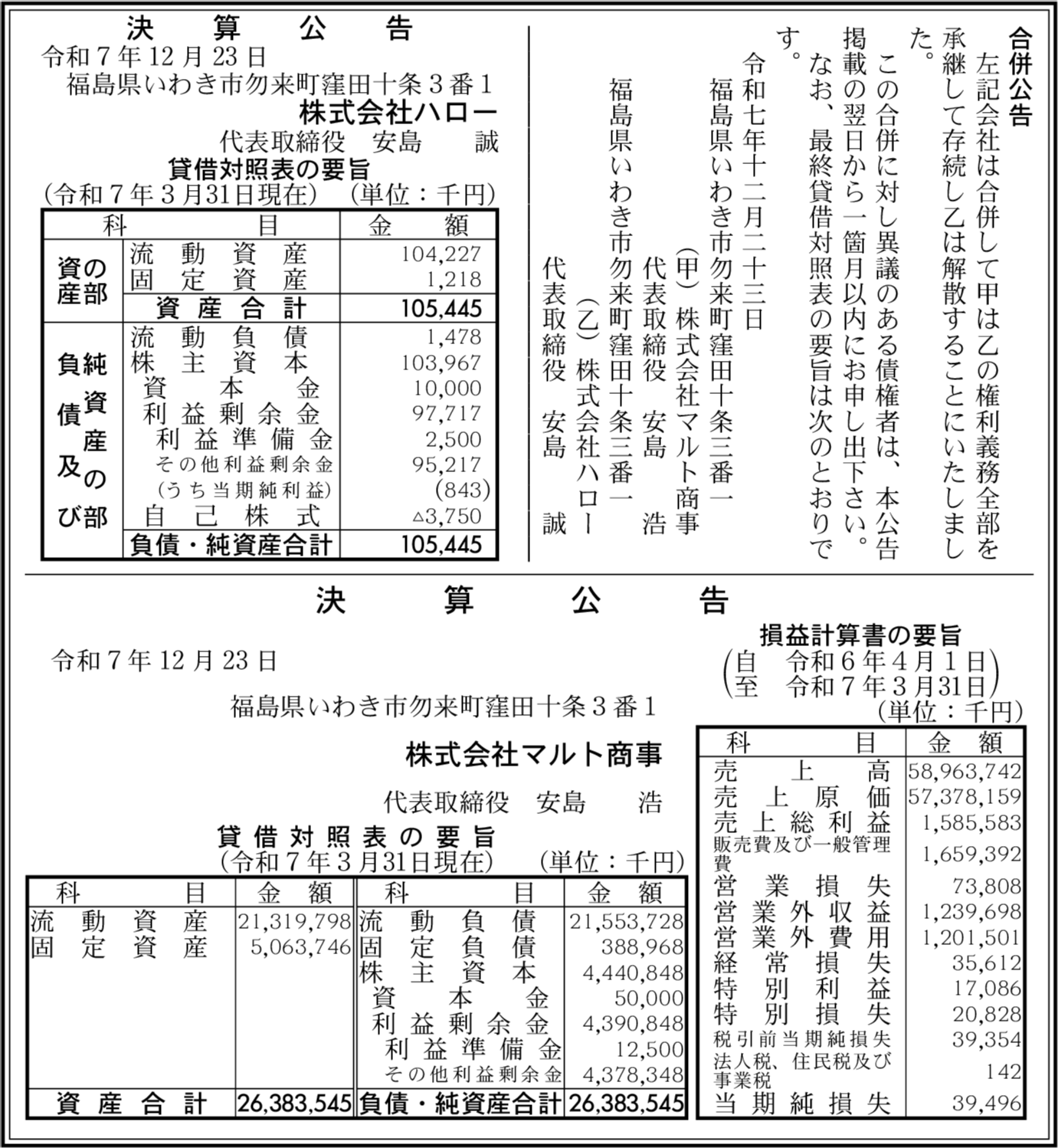 株式会社マルト商事 福島県いわき市 【2025年3月期】 |