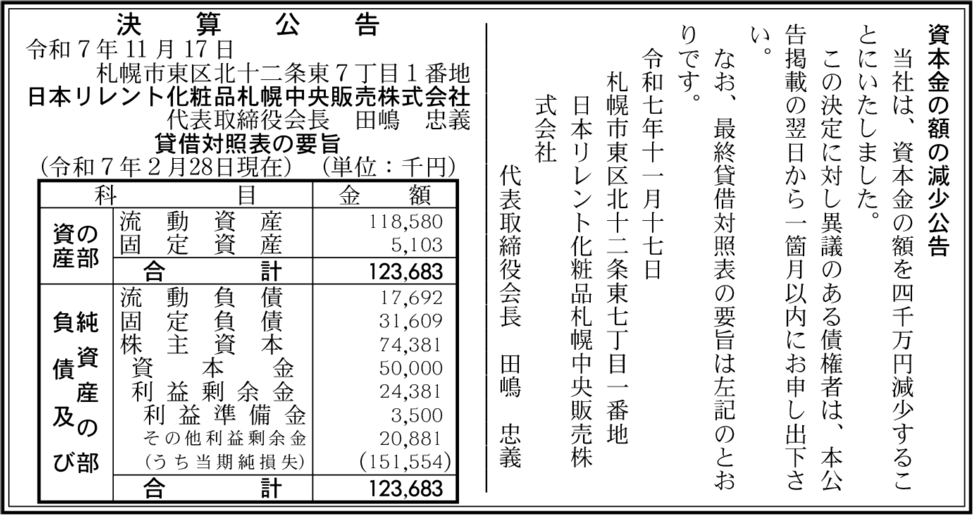 | 会社名 | 日本リレント化粧品札幌中央販売株式会社 |