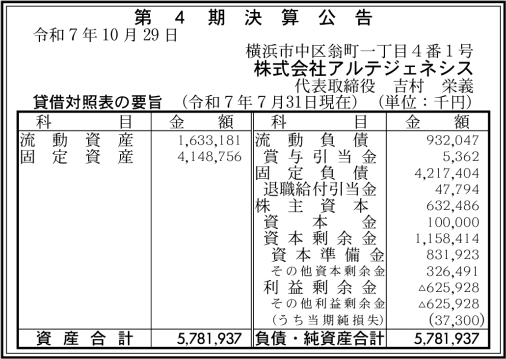 | 利益剰余金 | △6億2,592万8,000円 (赤字拡大) |