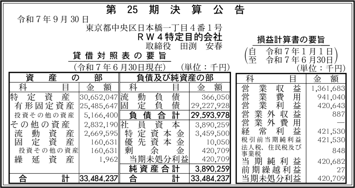 RW東扇島特定目的会社 東京都中央区 【2025年6月期】 |