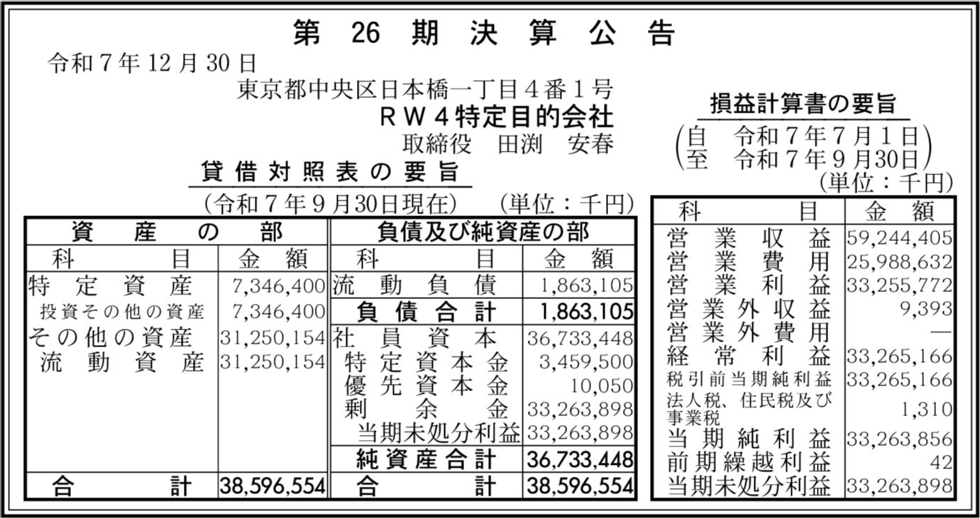 | 会社名 | RW4特定目的会社 |