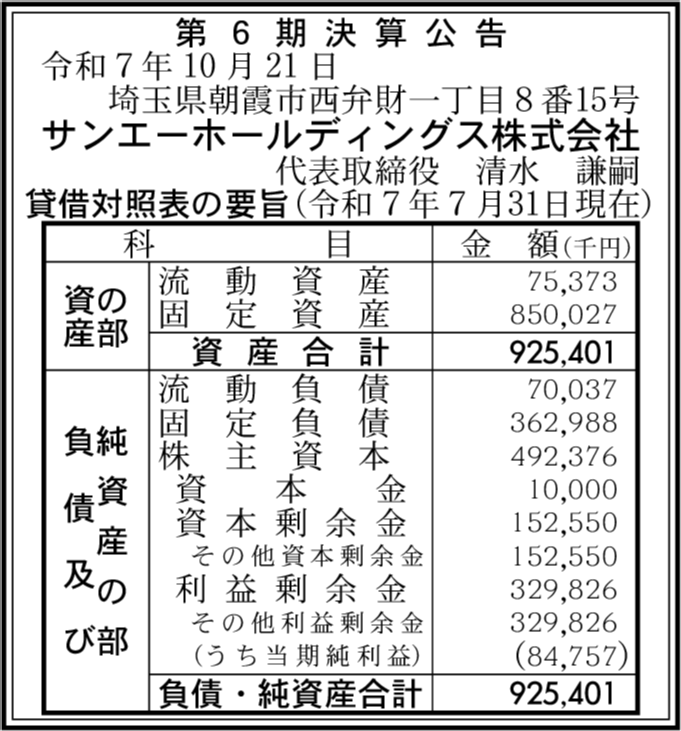 サンエー精工株式会社 埼玉県朝霞市 【2025年7月期】 |