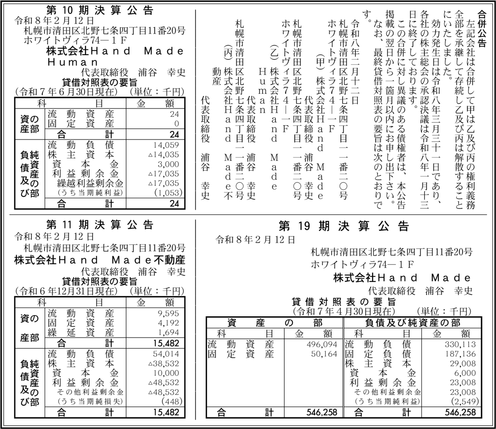 株式会社Hand Made Human 札幌市清田区 【2025年6月期】 |