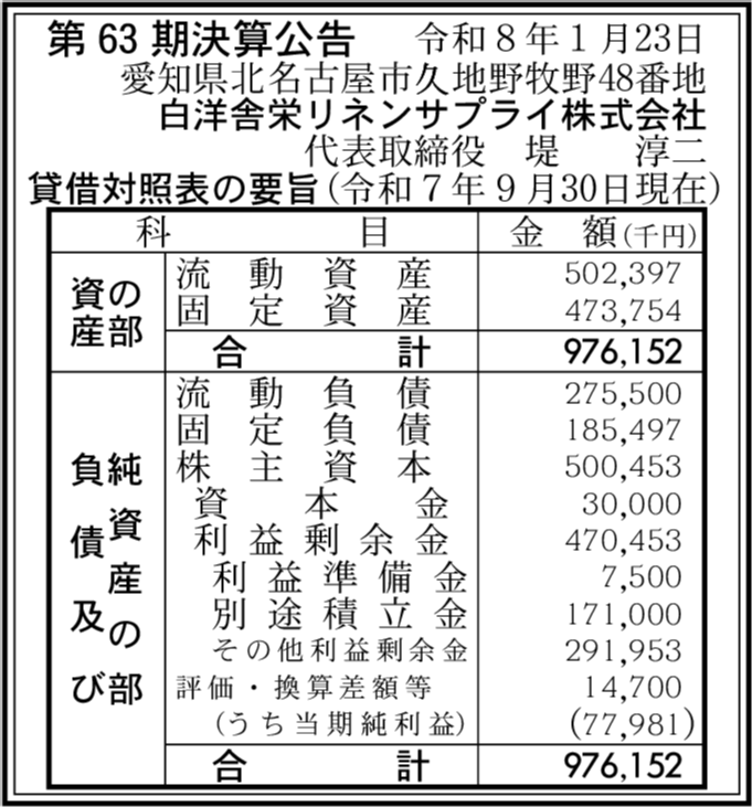 | 総資産 | 9億7,615万2,000円 (+3.66%) |
