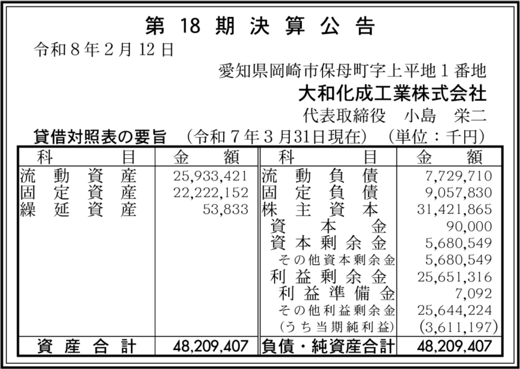 | 会社名 | 大和化成工業株式会社 |