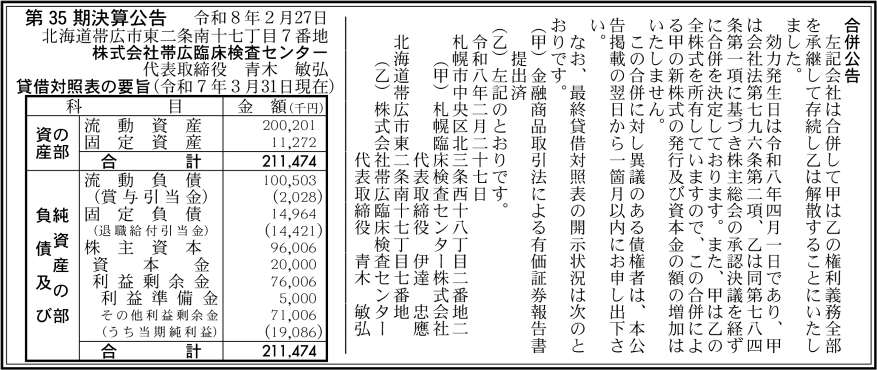 | 親会社・関連会社等 | 札幌臨床検査センター株式会社(2) |