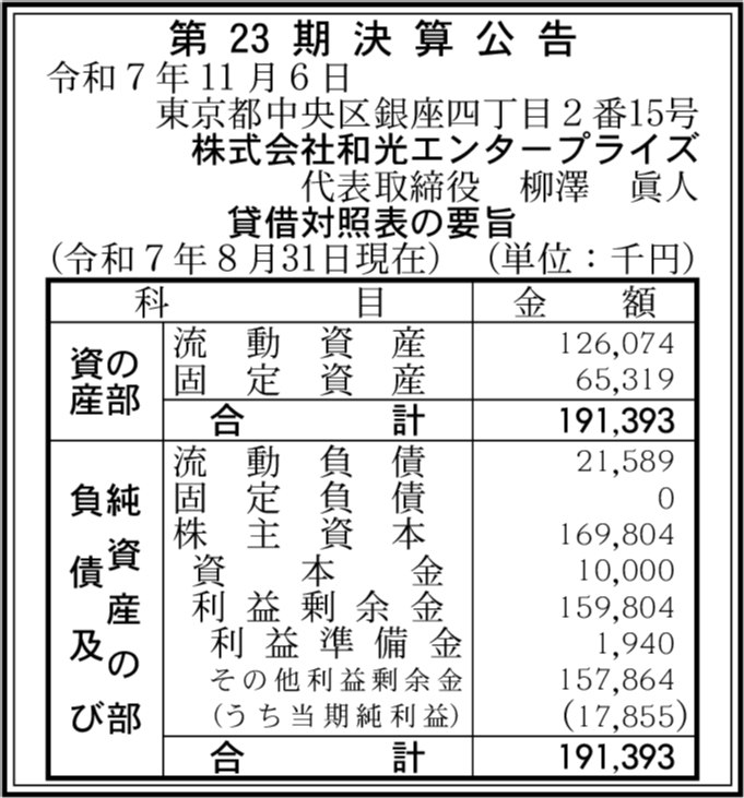| 利益剰余金 | 1億5,980万4,000円 (+5.69%) |