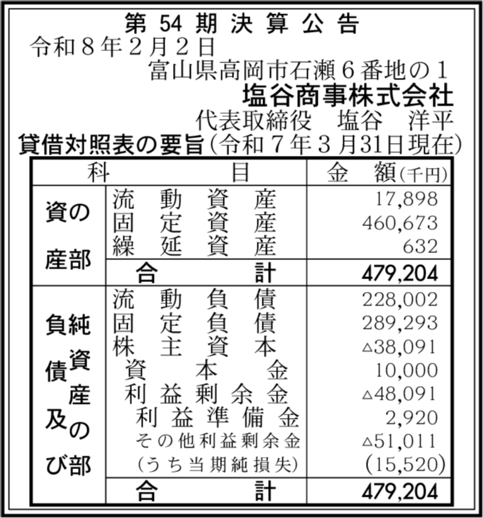 塩谷建設株式会社 富山県高岡市 【2020年3月期】 |