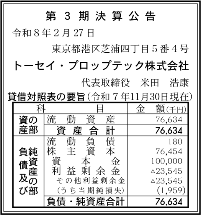 トーセイ・アール株式会社 東京都港区 【2024年11月期】 |