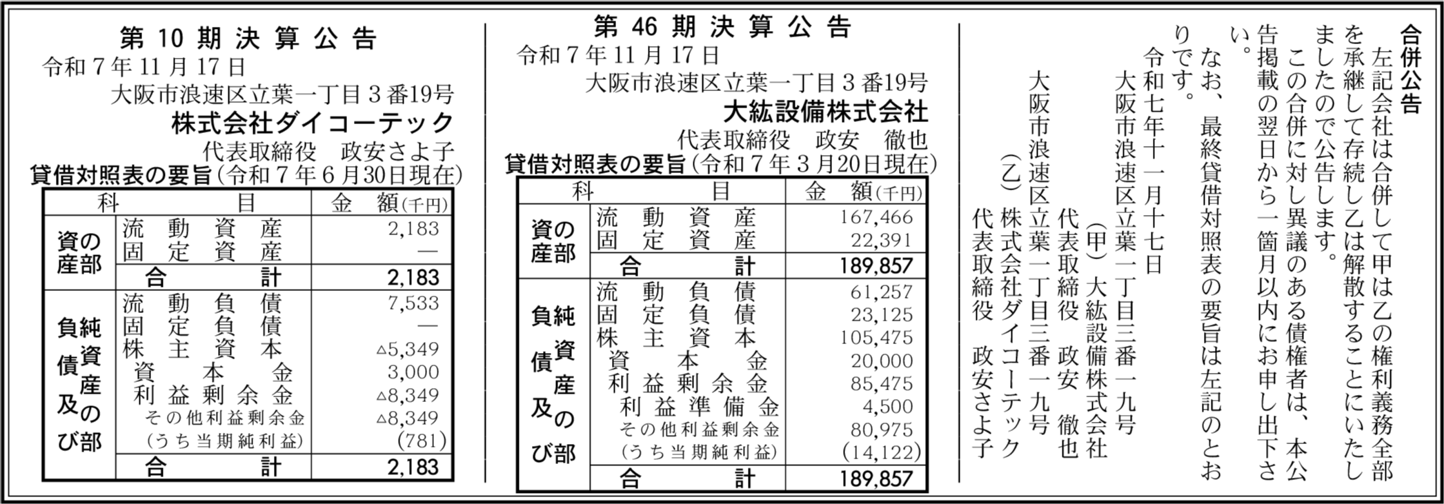 株式会社ダイコーテック 大阪市浪速区 【2025年6月期】 |