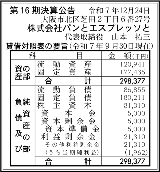 パンとエスプレッソと株式会社閉鎖済み 東京都千代田区 【2022年9月期】 |