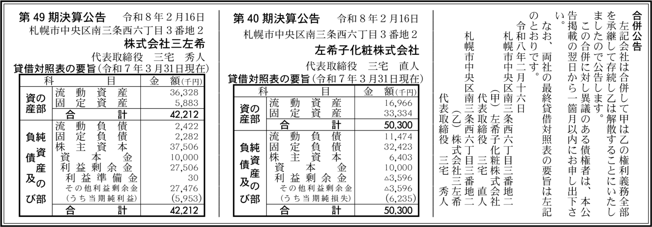 左希子化粧株式会社 札幌市中央区 【2025年3月期】 |